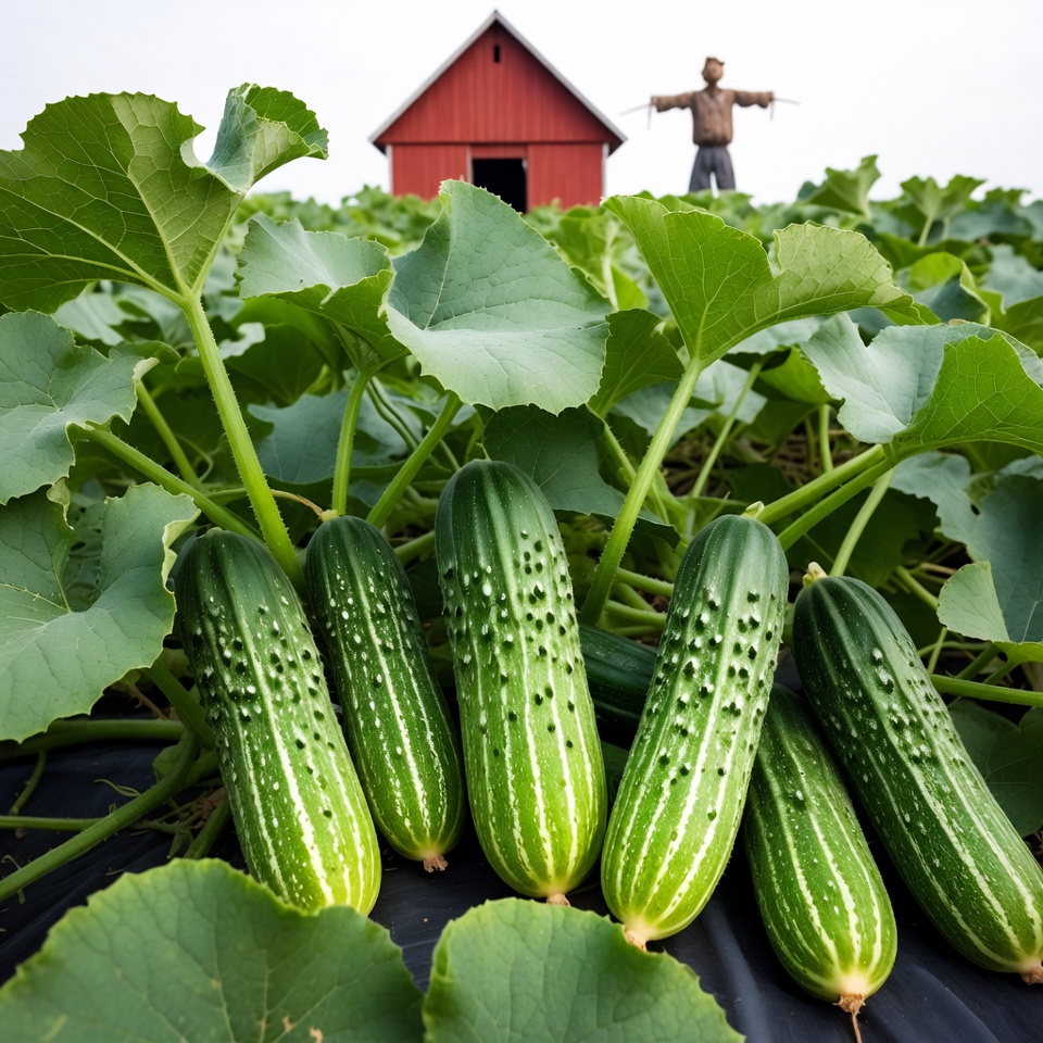 Fresh Cucumbers with Scarecrow and Red Barn
