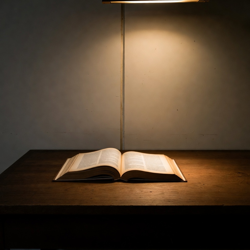 An open book with visible pages sits centered on a wooden table. A hanging lamp above casts warm light directly onto the book, creating a bright glow on the pages. The background is a plain dark wall with soft shadows.
