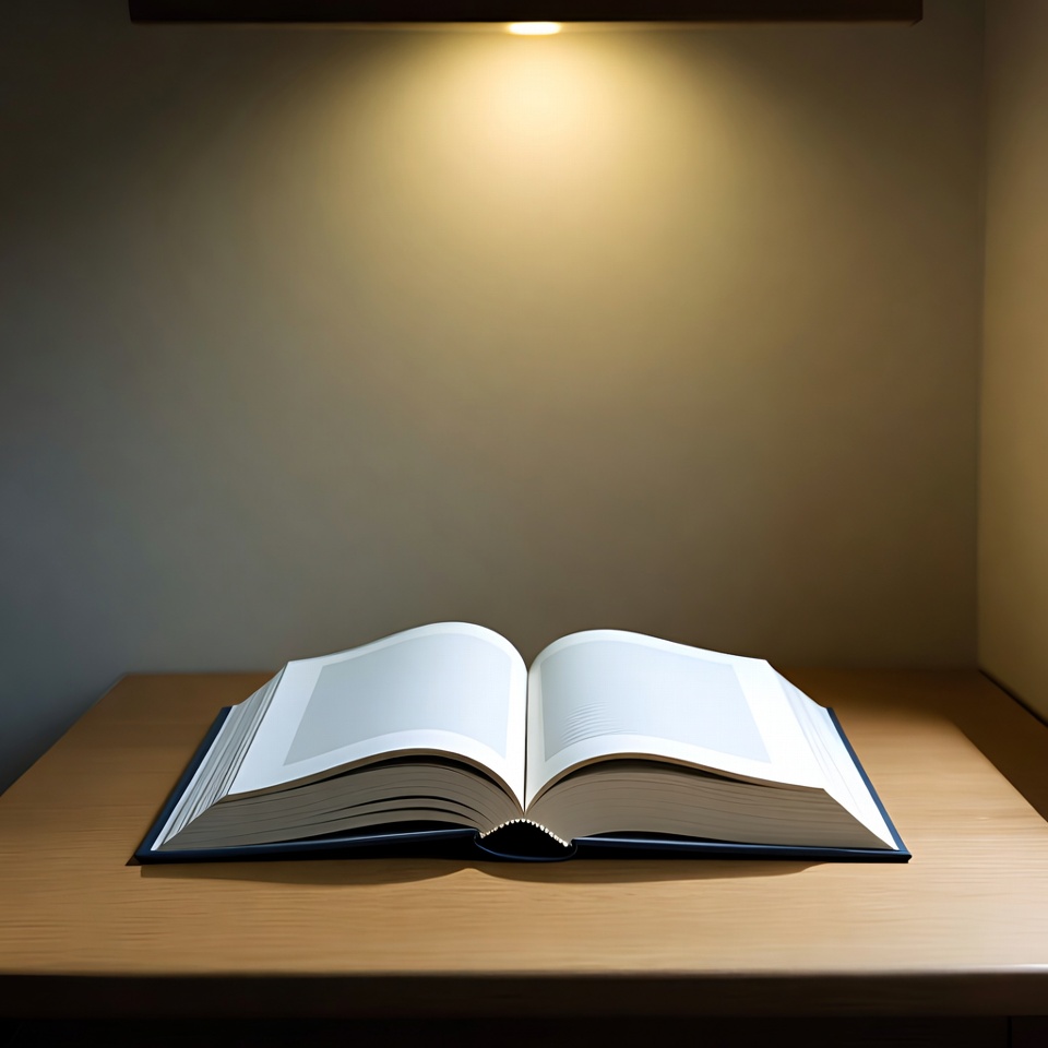 An open book with blank pages rests on a wooden table. A wall-mounted lamp above casts a warm glow on the book and surrounding beige walls. The scene features a simple, dimly lit corner setup.