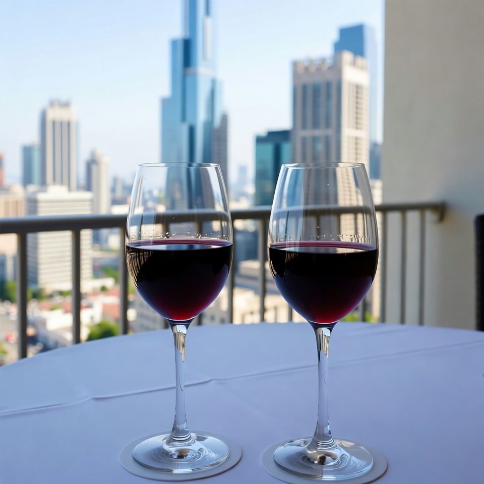 alcohol, balcony, blue sky, city skyline, cityscape, drink, high-rise buildings, modern architecture, outdoor, railing, skyscrapers, stemware, table, two glasses, urban view, white table, wine glasses, red wine