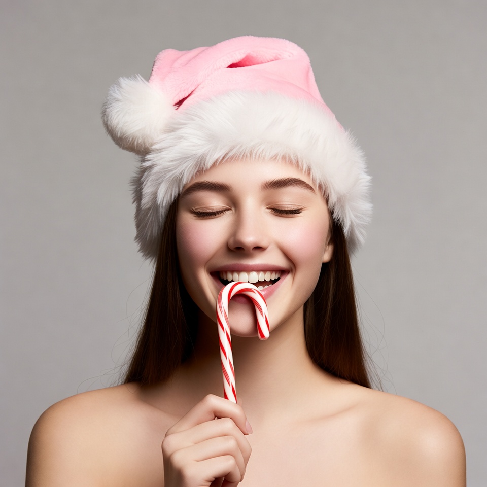 A nude young woman with long brown hair wears a pink Santa hat with white fur trim. She smiles while licking a red and white striped candy cane held in her hand. Her eyes are closed in enjoyment against a plain gray background.