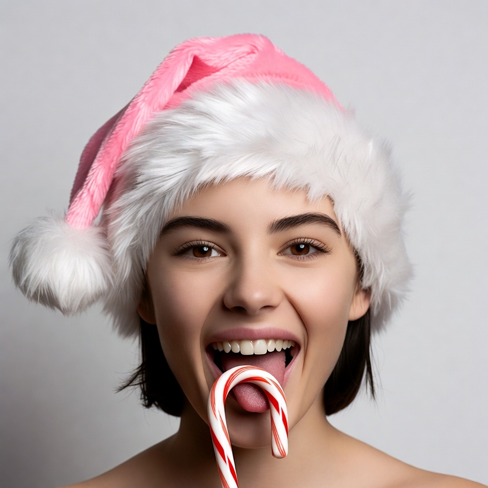 A young woman with short dark hair wears a pink Santa hat with white fur trim and a large pom-pom. She smiles widely while licking a red and white striped candy cane, positioned against a plain white background. Her face is close-up, showing dark eyes and full lips.