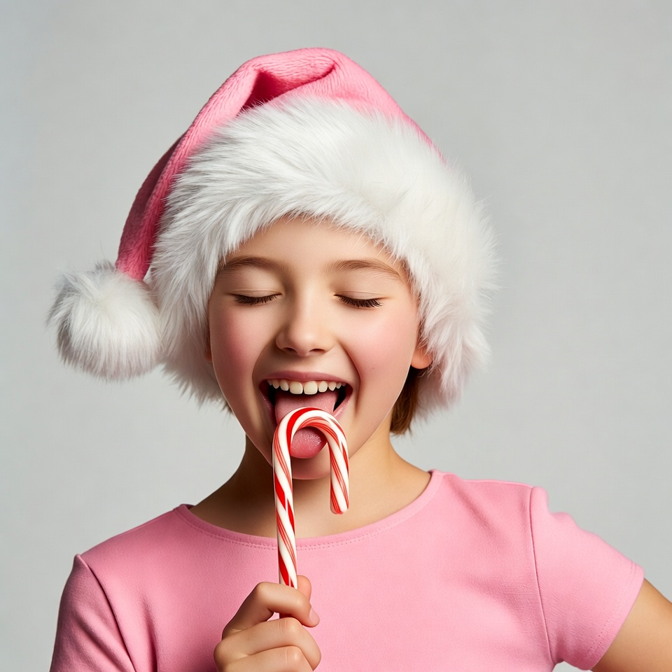 A young girl with closed eyes licks a large red and white candy cane. She wears a fluffy pink Santa hat with a white pom-pom and a matching pink dress. The image is set against a plain gray background.