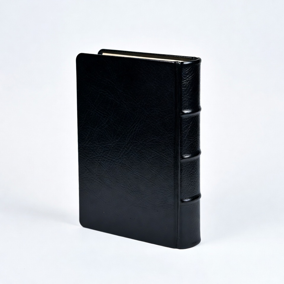 A black leather-bound book stands upright on a white background. The cover features textured leather with three raised spine bands. The book is closed, revealing cream-colored pages along the edges.