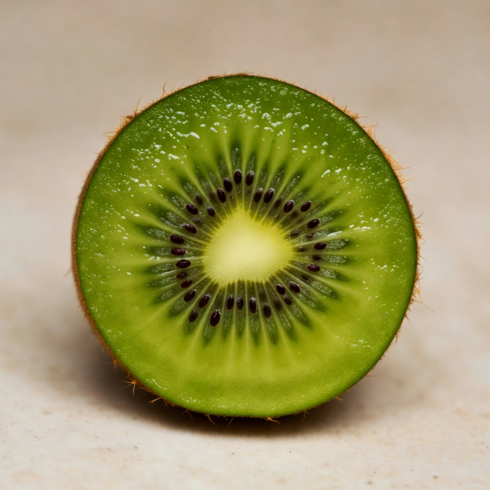A fresh kiwi fruit is sliced in half and placed on a light beige background. The vibrant green flesh features tiny black seeds surrounding a pale yellow center. The brown fuzzy skin contrasts with the juicy interior.