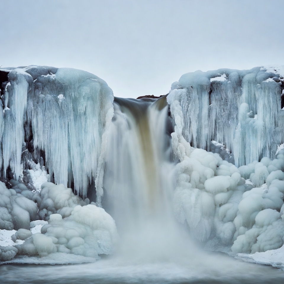 A majestic waterfall cascades between towering walls of thick ice and snow. Icicles hang extensively from the frozen rock formations surrounding the flowing water. The scene features a serene pool at the base under a cloudy sky.