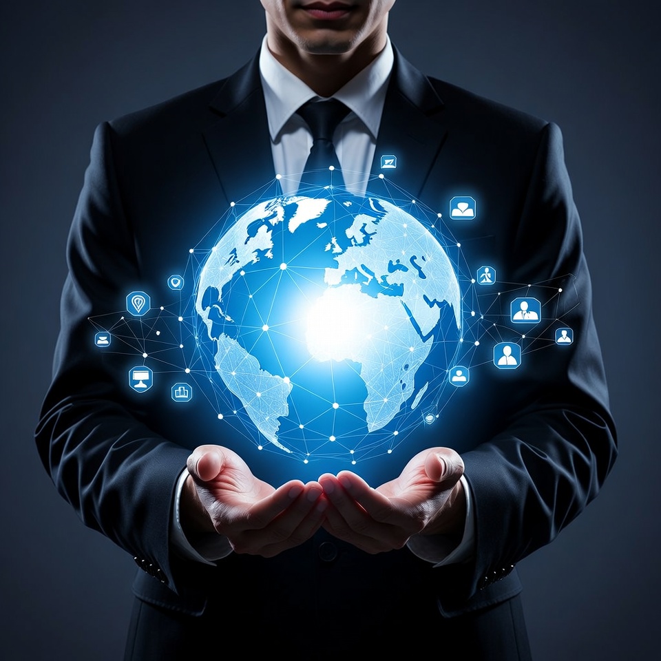 A man in a dark suit holds a luminous blue globe in his hands against a dark background. The globe features glowing digital icons such as networks, people profiles, and communication symbols. He stands confidently with the Earth-like sphere centered in his grasp.