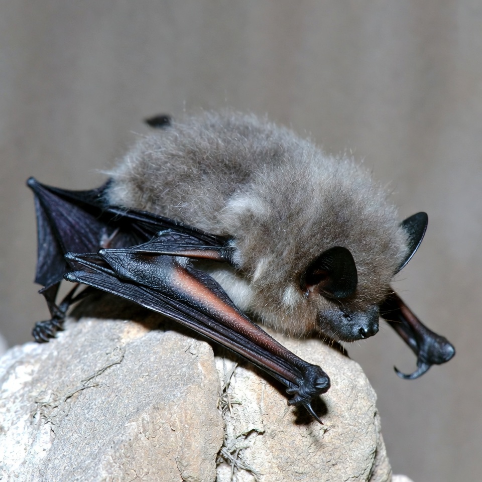 animal, bat wings, black wings, claws, ears, furry bat, gray bat, isolated background, mammal, nocturnal animal, perched bat, rock perch, wildlife, bat
