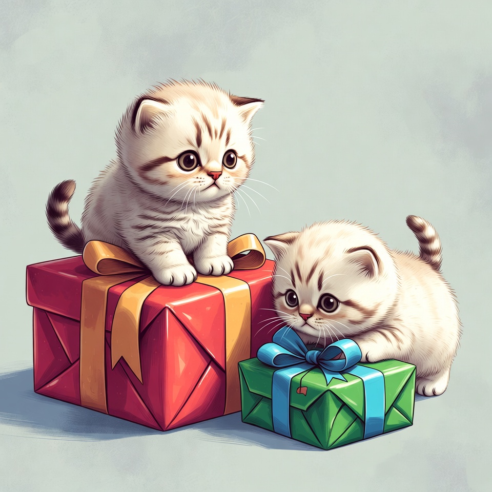 Two fluffy Scottish Fold kittens sit playfully with colorful gift boxes on a light gray background. One kitten perches atop a large red box tied with a gold ribbon, while the other paws at a green box with a blue bow. Their wide eyes and soft fur create an adorable illustration scene.
