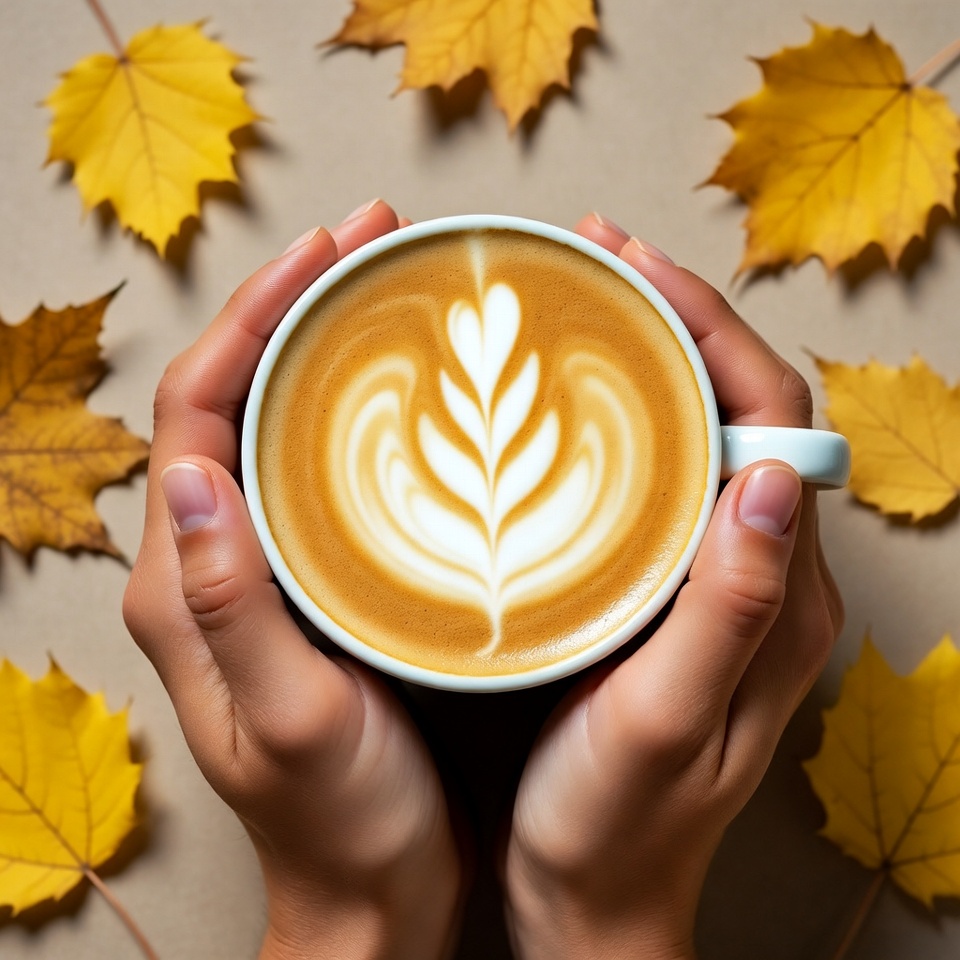Hands Holding Latte with Autumn Leaves