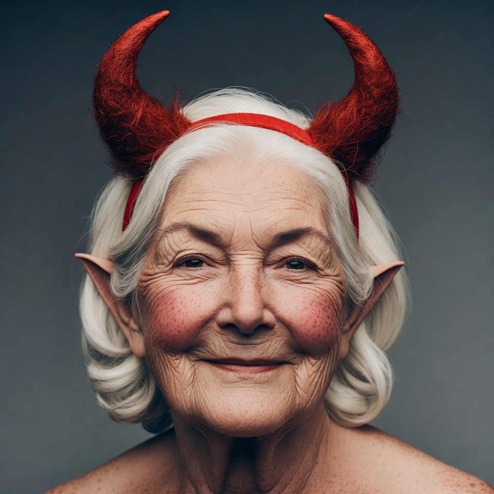 Halloween costume, White, costume, devil horns, elf ears, female, furry horns, gray background, headband, old woman, portrait, red horns, rosy cheeks, senior, smiling, white hair, wrinkles, elderly woman