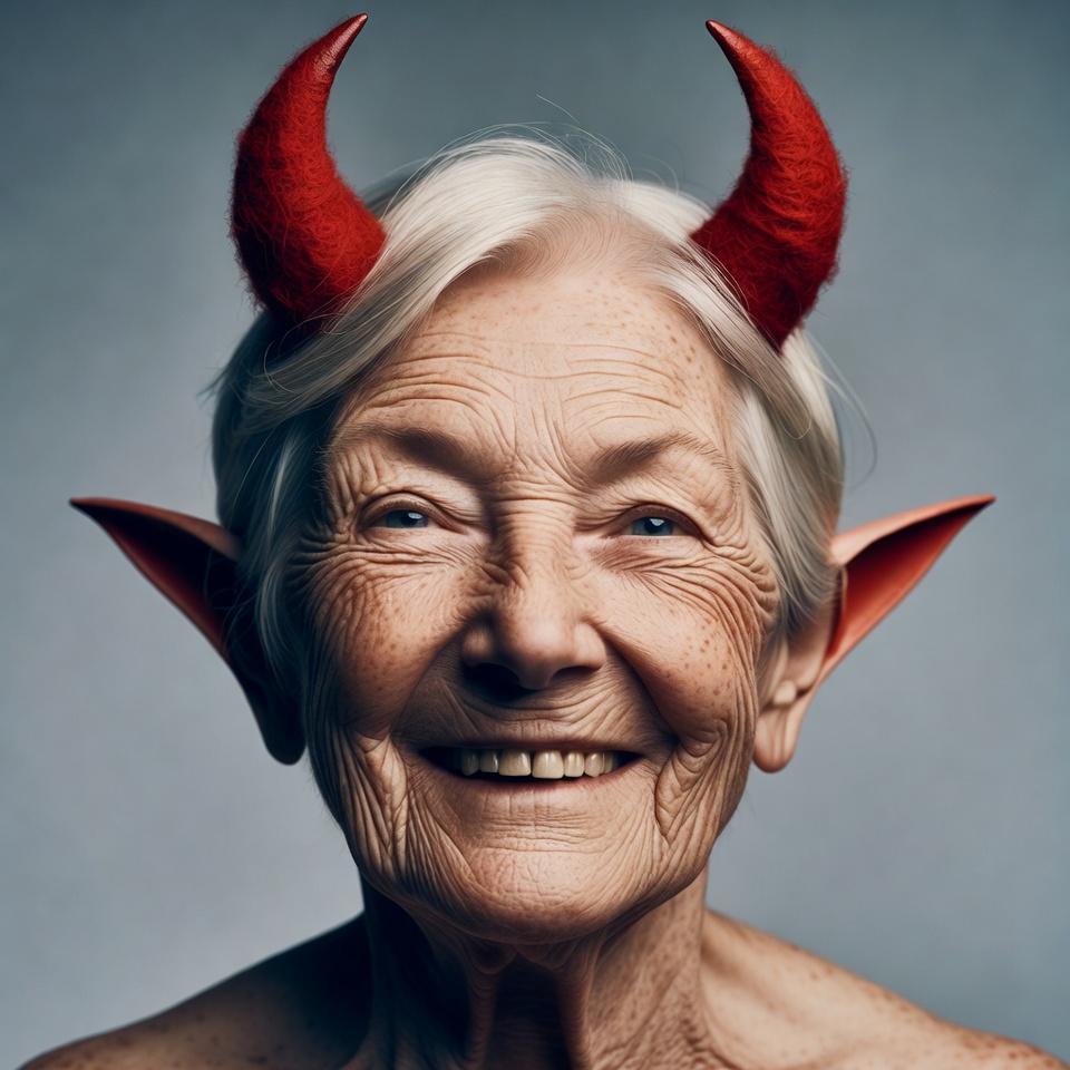 Elderly woman with red devil horns