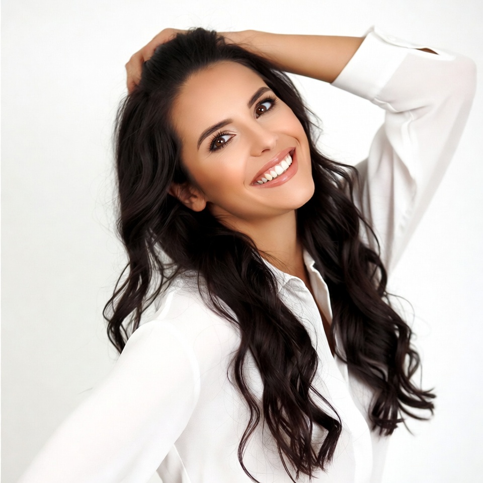 A young Latina woman with long dark wavy hair smiles happily while touching her hair with her hand. She wears a white sheer blouse with rolled sleeves and poses against a plain white background. Her head is tilted slightly, highlighting her bright smile and brown eyes.