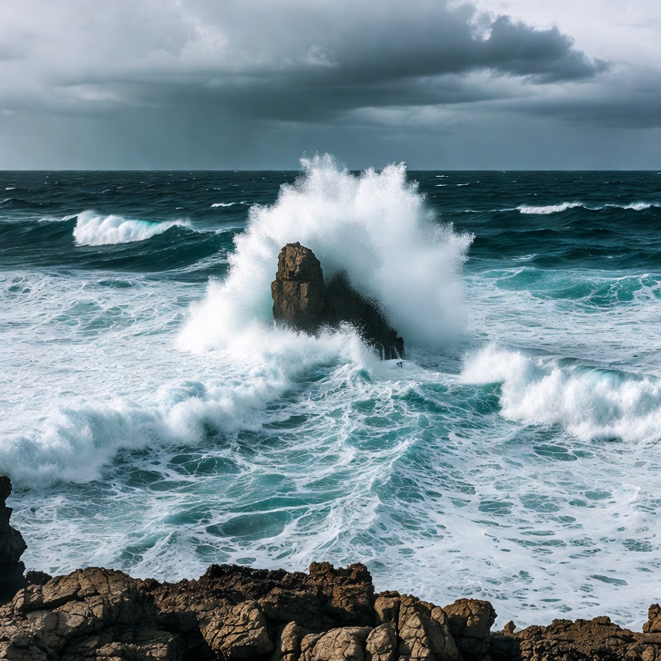 Massive waves crash dramatically against a tall rock formation rising from the turbulent ocean. Dark storm clouds loom overhead, adding intensity to the scene. White foam sprays high as turquoise and deep blue waters churn around rugged coastal rocks.