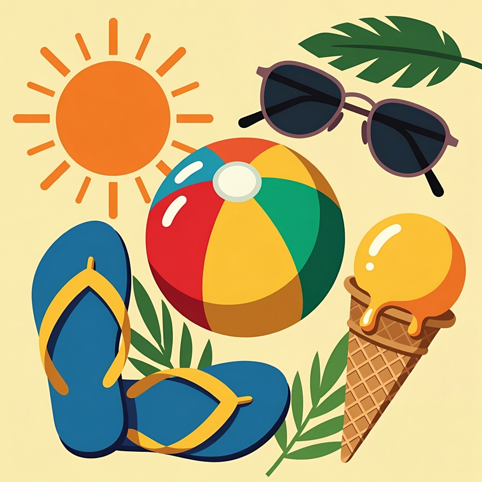 A vibrant illustration features a bright orange sun, colorful beach ball, sunglasses, flip flops, palm leaves, and melting ice cream cone. All elements are arranged on a plain yellow background in a flat clipart style. The items represent classic summer and beach vacation symbols.