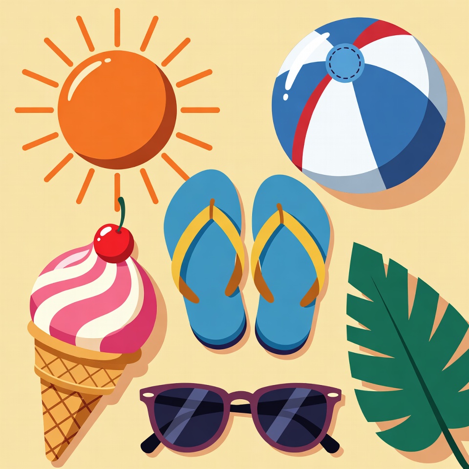 A vibrant illustration features beach essentials on a sandy yellow background. Items include a bright sun, blue and white beach ball, flip flops, pink ice cream cone with cherry, sunglasses, and green palm leaf. All elements are colorful and flat-designed for a fun summer theme.