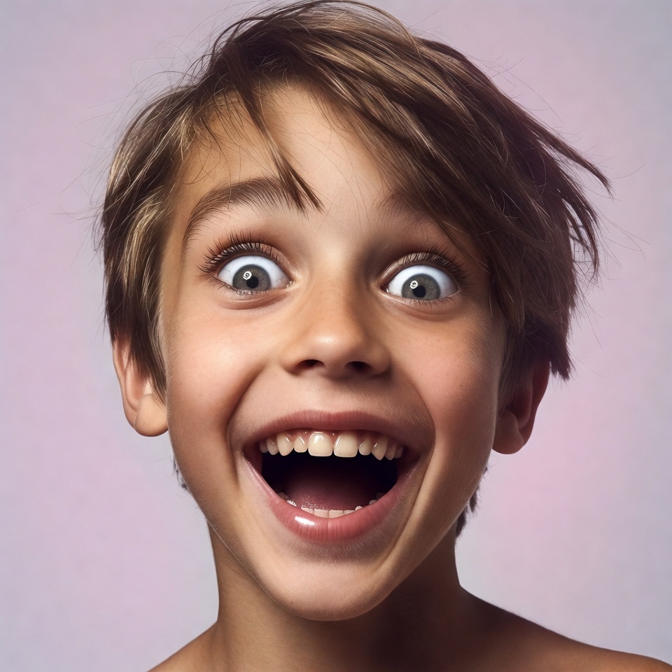 White, big smile, brown hair, cartoonish expression, child, close-up, excited boy, expressive face, happy face, isolated background, joyful boy, male, open mouth, pink background, portrait, shocked expression, short hair, smiling child, surprised expression, wide eyes, young boy, boy