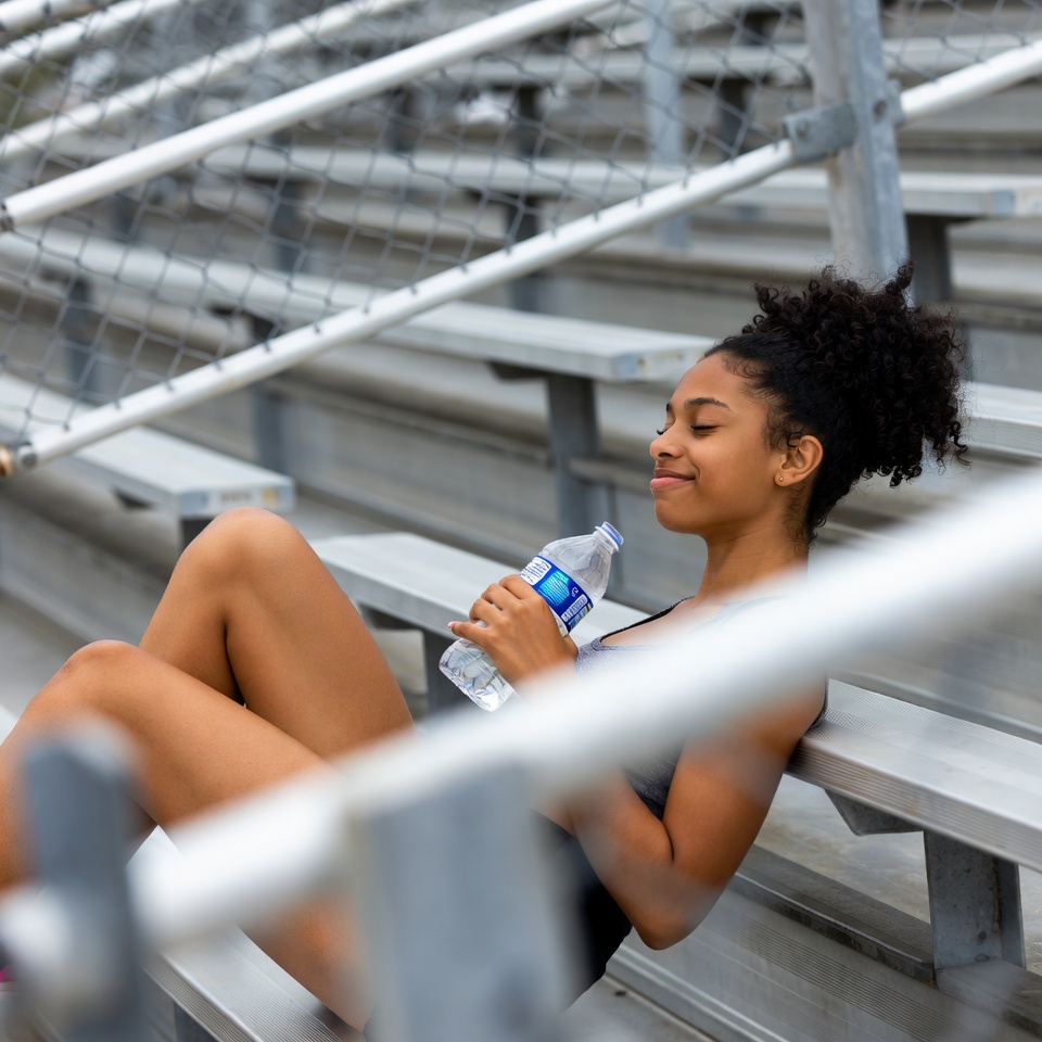 A young Black woman with curly hair sits relaxed on metal bleachers, holding a plastic water bottle to her lips. She wears a black sports bra and shorts, with her legs extended. The background features empty stadium seating.