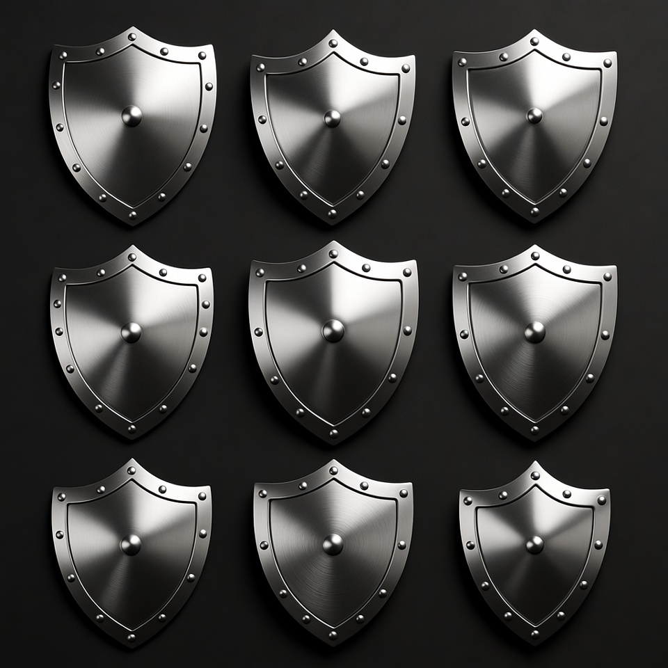 3D render, armor shields, black background, convex shields, curved edges, grid arrangement, knight shields, medieval shields, metal shields, nine shields, polished metal, reflective surface, shiny shields, silver shields, shields