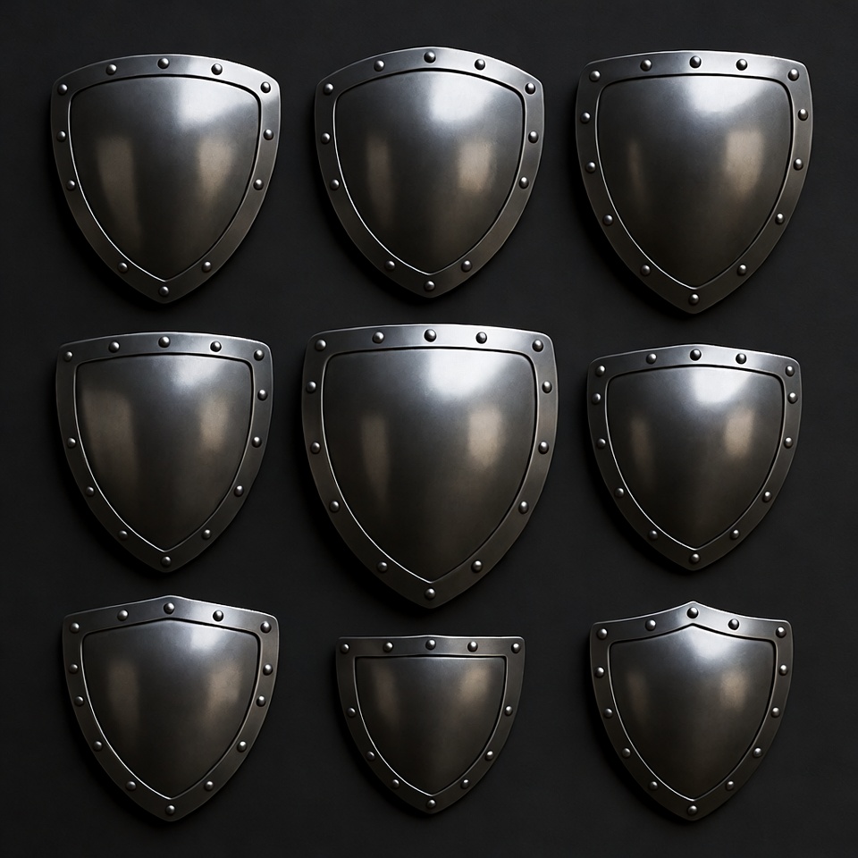 Nine metallic shields with rounded tops and studs are arranged in a 3x3 grid. They feature a glossy silver finish and are displayed against a solid black background. The shields vary slightly in size but share a uniform medieval design.