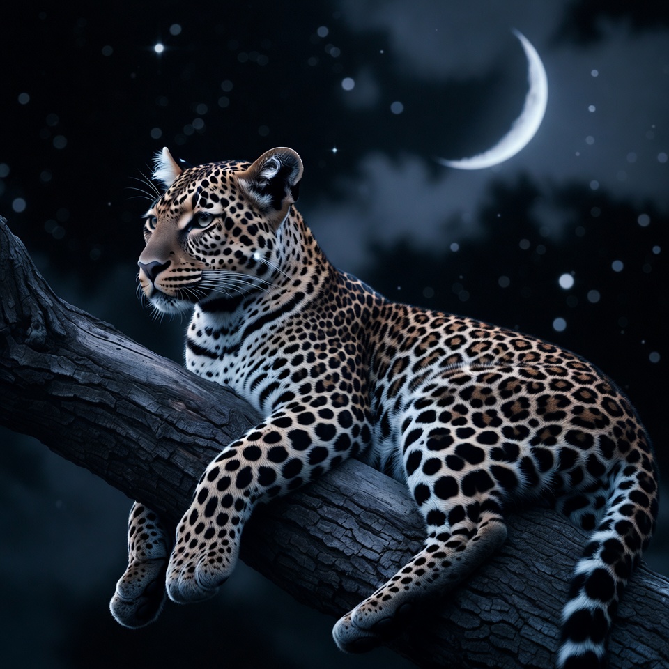 A majestic leopard with spotted fur sits on a gnarled tree branch. It gazes intently with glowing eyes amid a dark night sky filled with stars and a crescent moon. The scene features a mystical, starry background with subtle clouds.