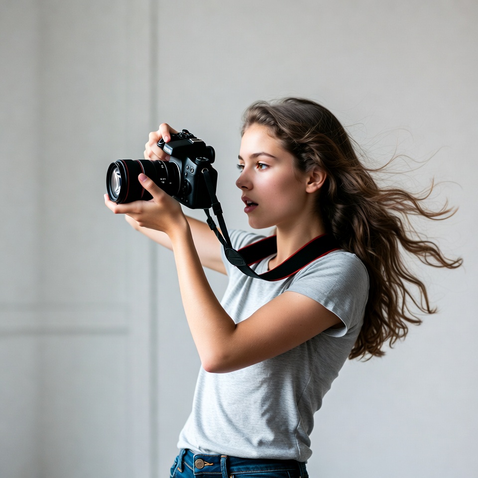 A young woman with long wavy brown hair holds a black DSLR camera with both hands while looking to the side. She wears a gray t-shirt with red trim, a camera strap around her neck, and blue jeans. She stands against a plain white background with her hair blowing slightly.