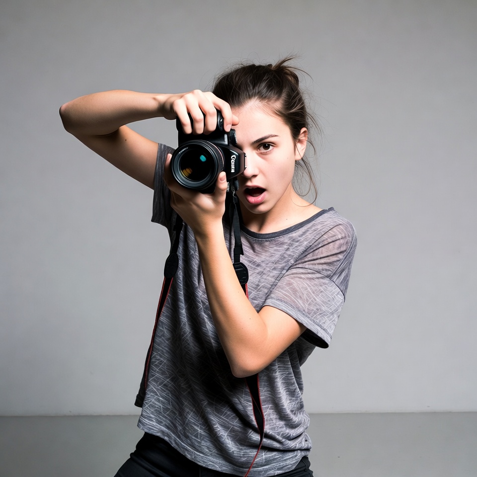 A young woman with dark hair in a bun holds a black DSLR camera to her eye on a gray background. She wears a loose gray tank top and black pants, with her mouth open in surprise. Her arms are extended as she peers through the camera lens intently.