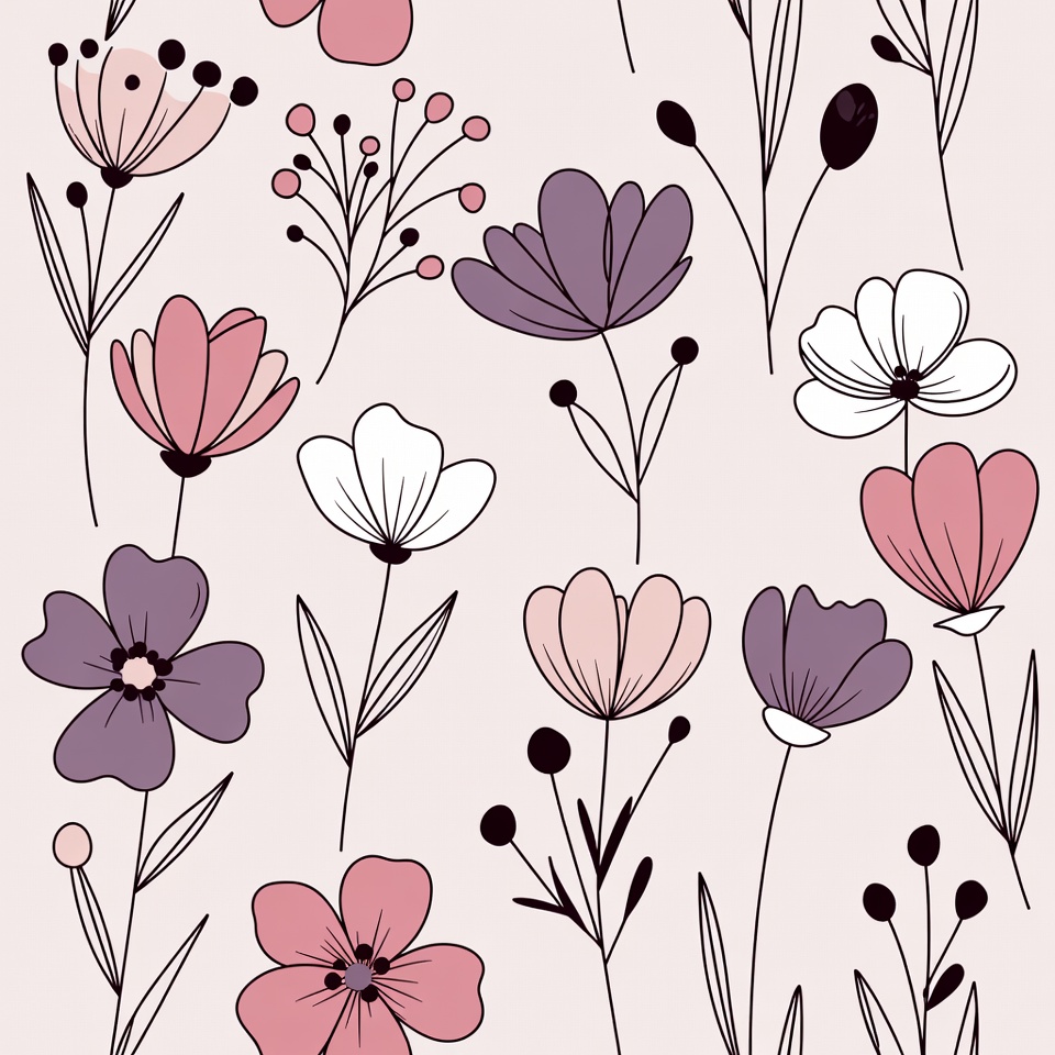 A seamless pattern features hand-drawn flowers in shades of pink, purple, and white on a light pink background. Delicate stems, leaves, and berries accompany the simple line art blooms arranged in a repeating design. The illustration style is minimalist and suitable for backgrounds or textiles.