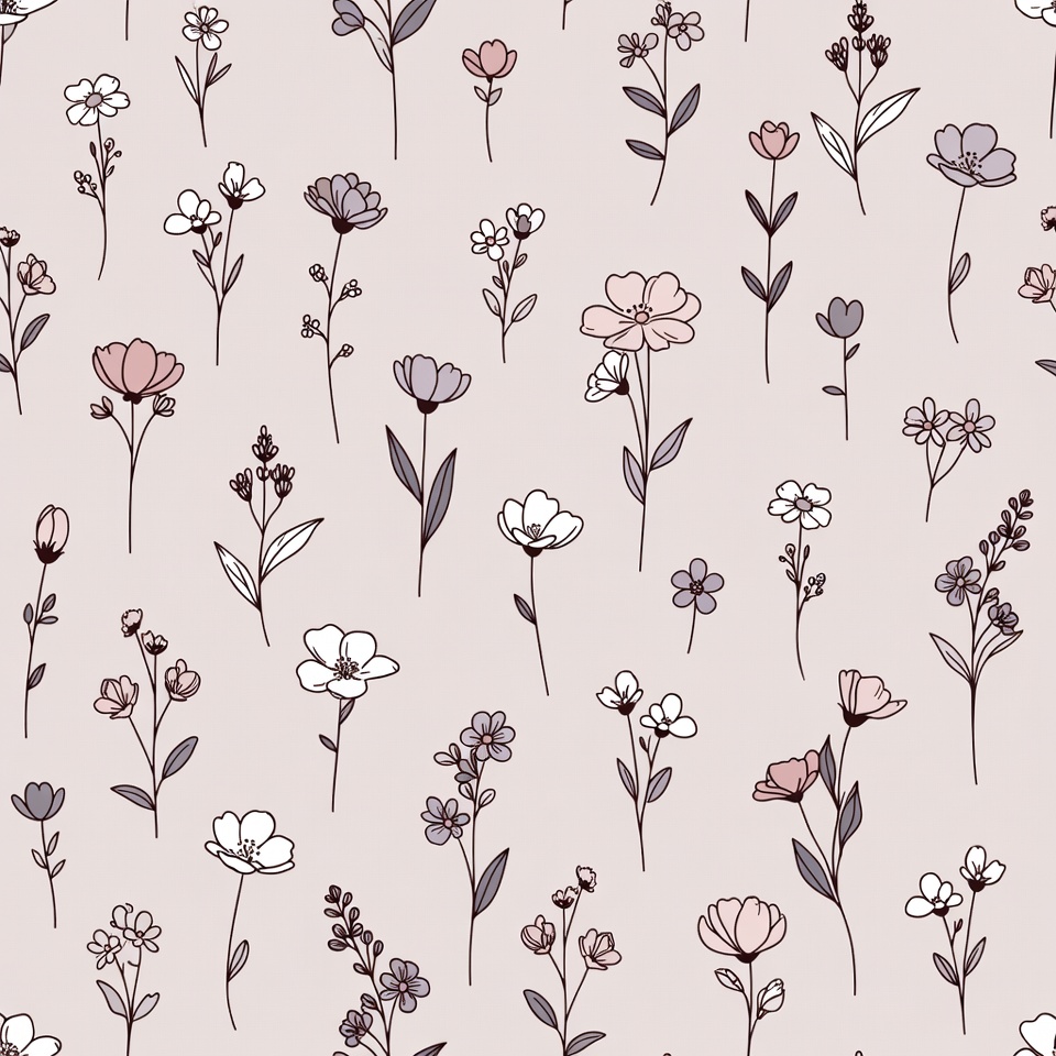 A seamless pattern features delicate hand-drawn wildflowers in soft pink, lavender, and white tones scattered across a light pink background. The illustration includes various small blooms with thin stems and leaves in a repeating floral design. The watercolor-style flowers create a gentle, repeating texture suitable for backgrounds.