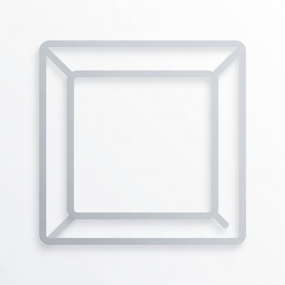 A minimalist silver wireframe cube is depicted with thin lines forming its edges and vertices on a white background. The geometric shape features a square base and top connected by vertical lines, creating a 3D outline effect. The design is clean and isolated, emphasizing transparency and structure.