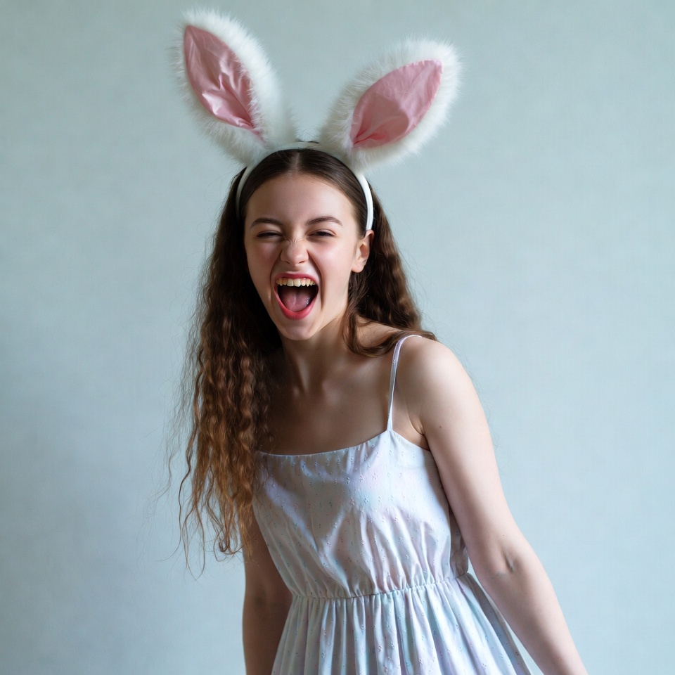 A young girl with curly brown hair and a wide smile laughs while wearing large pink bunny ears headband. She has on a light-colored spaghetti strap dress and poses against a plain white background. Her eyes are squinted in joy.