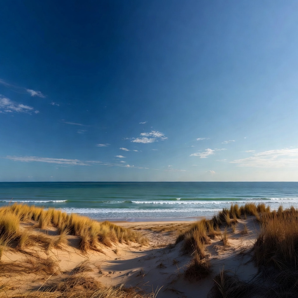 A sandy path winds through tall golden dunes covered in beach grass toward the ocean. Gentle waves crash on the shore under a clear blue sky with scattered clouds. The scene captures a serene coastal landscape at the beach.