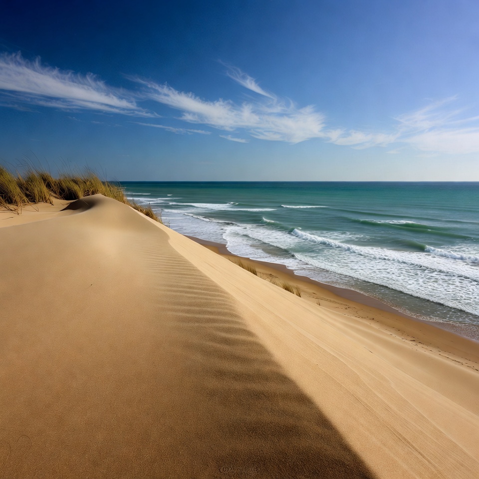 Tall sand dunes with golden ripples slope down to meet crashing ocean waves. Sea grass grows atop the dunes under a clear blue sky with scattered white clouds. The turquoise sea extends to the horizon.