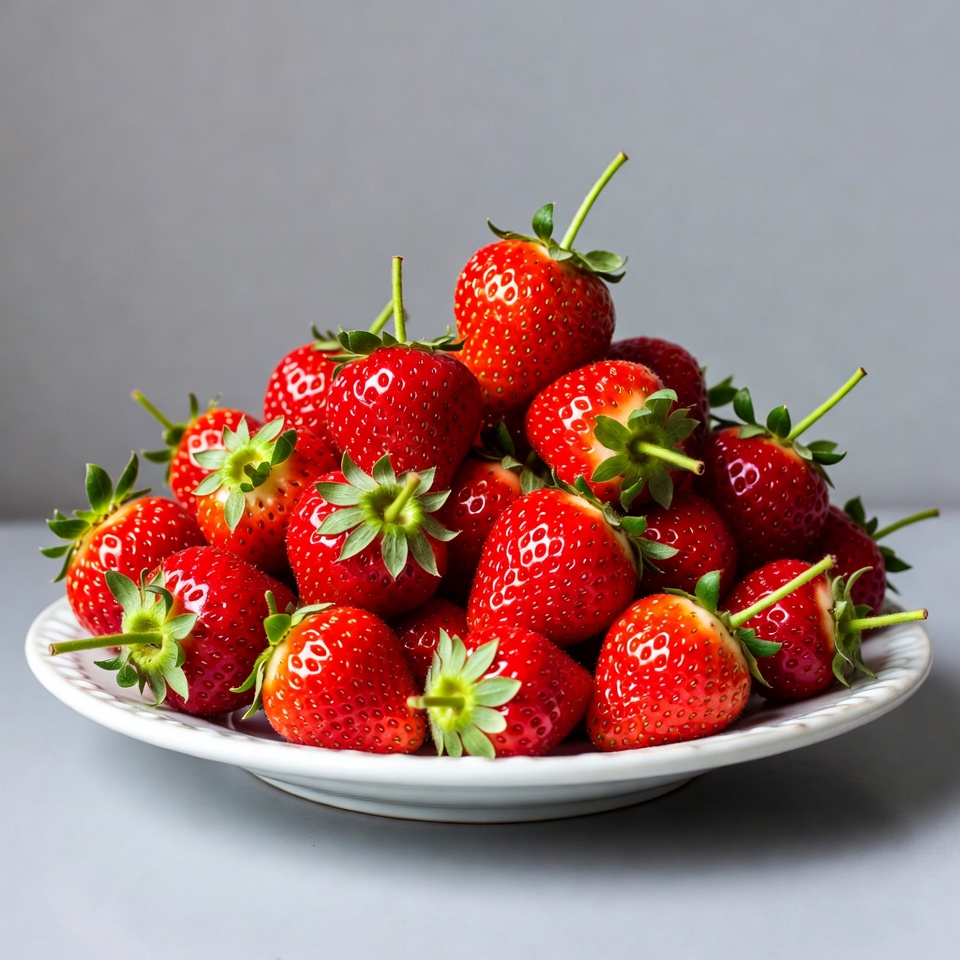 A pile of vibrant red strawberries with green stems is arranged on a white plate. The berries are fresh and glossy, stacked high in the center. The plate sits on a plain gray background.