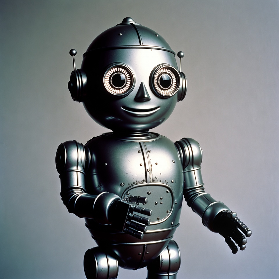 A small silver robot with a shiny metallic body stands on a plain gray background. It features large glowing eyes, antenna ears, and a friendly smiling mouth. The robot has articulated arms raised slightly and sturdy legs.