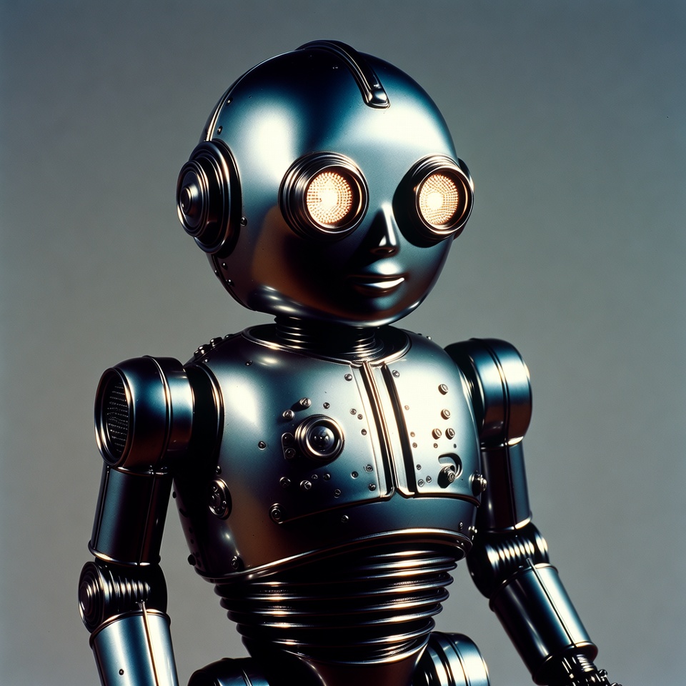A metallic blue humanoid robot stands on a plain background. It features a rounded head with glowing yellow eyes, antenna, and ear-like sensors. The robot has segmented arms, a vented chest, and jointed legs.