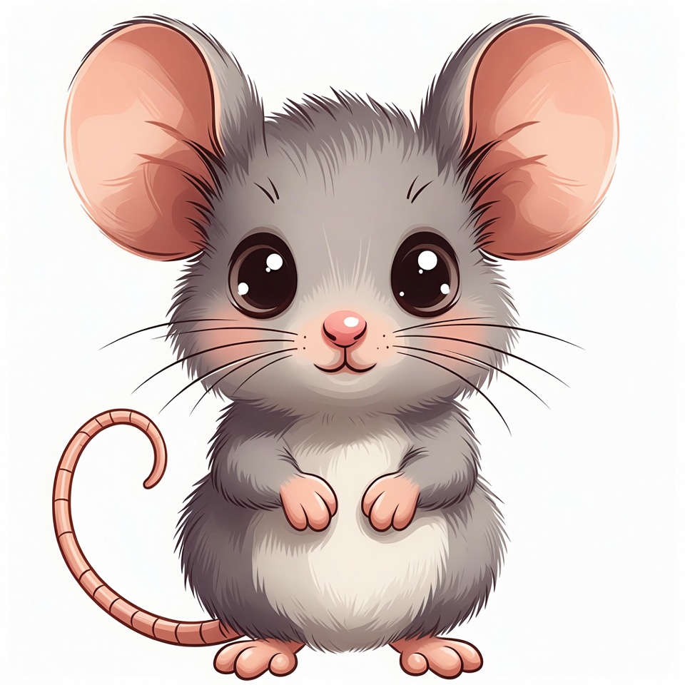 adorable rodent, animal illustration, big eyes mouse, cartoon mouse, clipart mouse, fluffy fur, gray mouse, isolated background, kawaii mouse, long tail, mouse illustration, pink ears, pink nose, pink paws, standing mouse, white belly, cute mouse