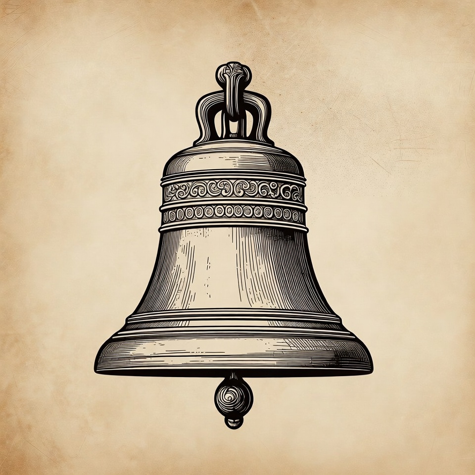 aged paper, bell, bell illustration, clapper, classic bell, detailed engraving, drawing, engraving, freedom bell, historical bell, isolated background, liberty bell, line art, metal bell, ornate bell, parchment paper, sketch, vector illustration, vintage illustration, church bell