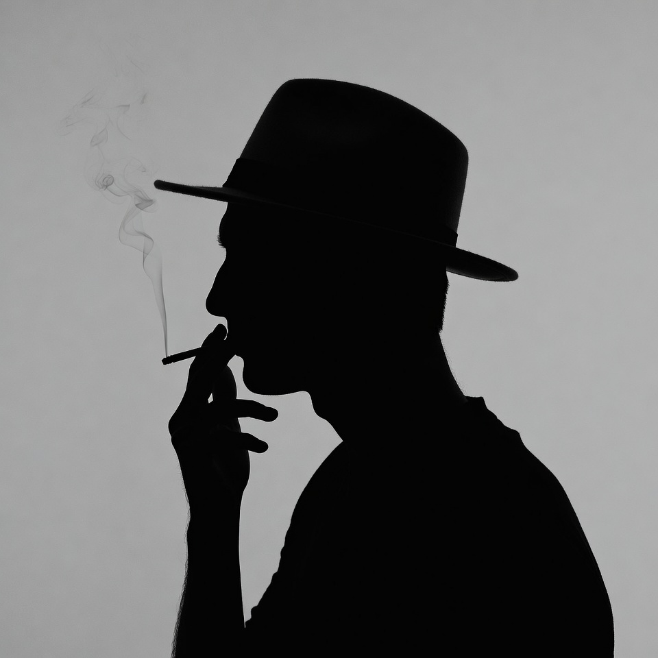 black, cigarette, fedora, fedora hat, hand holding cigarette, hat, isolated, male, man, noir, profile, profile view, shadow, smoke, smoking, smoking man, white background, silhouette