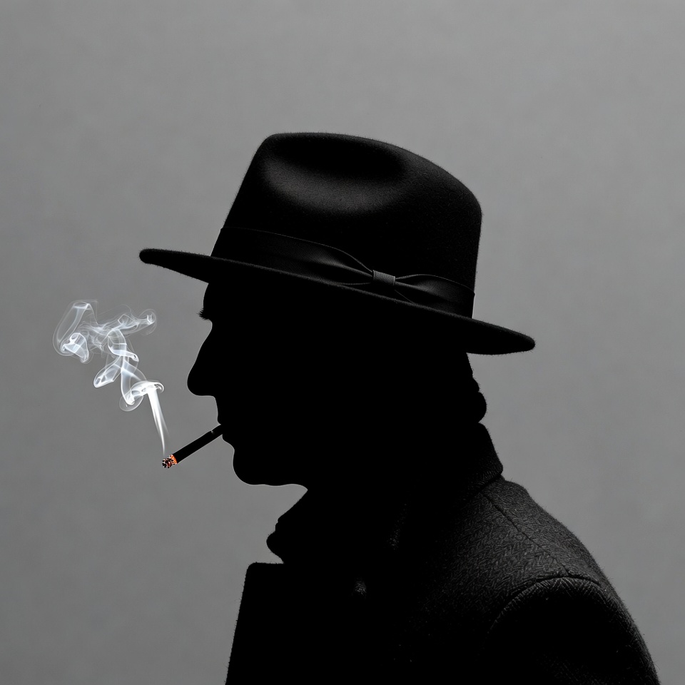 A silhouette of a man in profile wears a black fedora hat and gray overcoat against a gray background. He holds a lit cigarette to his lips with smoke curling upward. The image captures a classic noir-style shadow portrait.