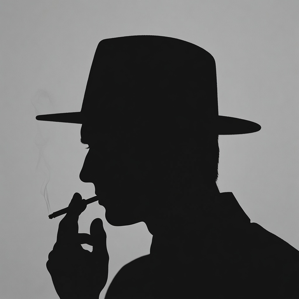 A black silhouette of a man in profile wears a fedora hat and suit jacket. He holds a lit cigarette to his mouth with smoke rising from it. The image is set against a plain gray background.