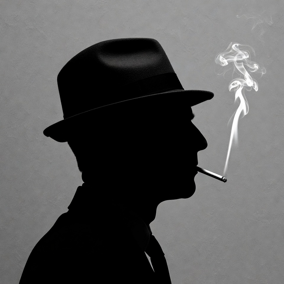 A black silhouette profile of a man wearing a fedora hat and suit with tie smokes a cigarette. White smoke swirls upward from the cigarette in his mouth against a light gray background. The image is rendered in high-contrast black and white.