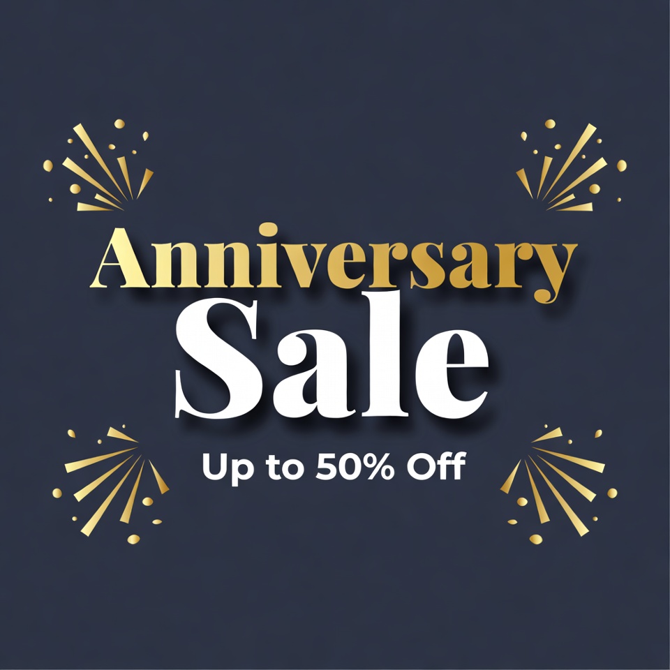 A promotional graphic features bold gold 'Anniversary Sale' text on a dark navy background. Golden fireworks and sparkles surround the text. Below it, white text reads 'Up to 50% Off' with a subtle shadow effect.