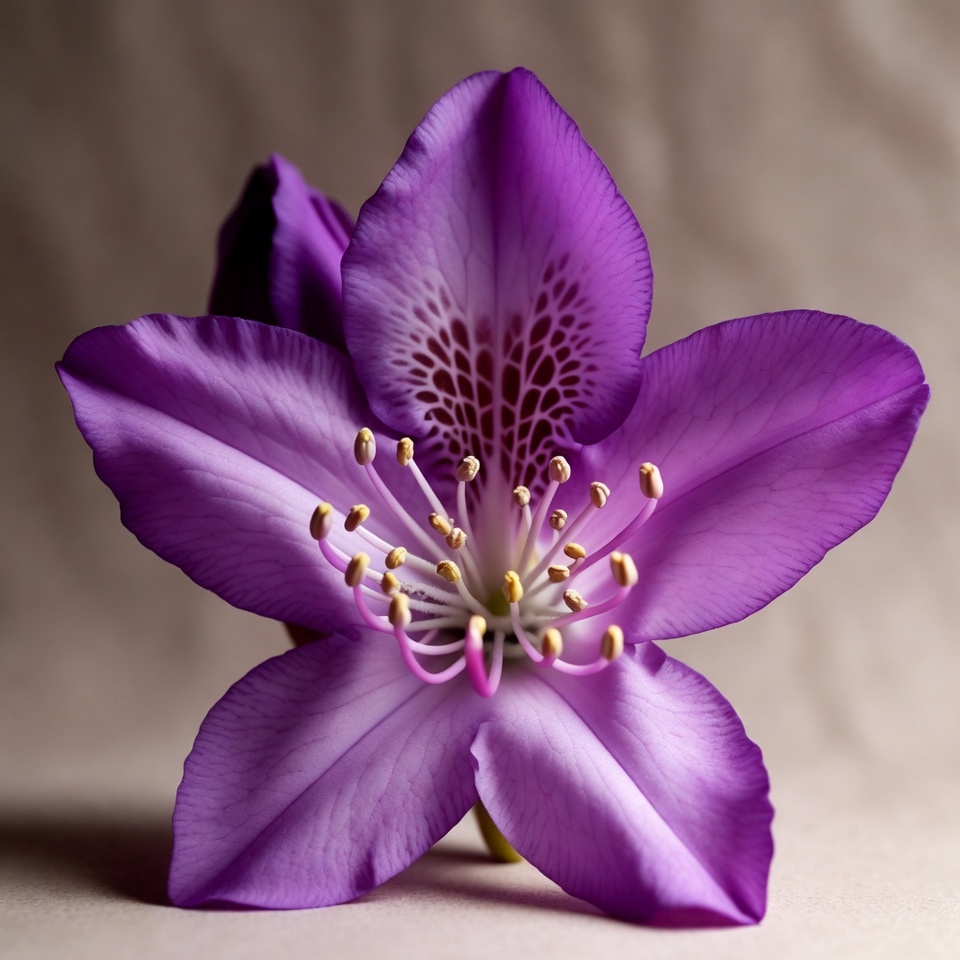 A vibrant purple hibiscus flower is captured in closeup with delicate petals and intricate yellow stamens in the center. The flower features veined petals and small buds nearby. It is set against a neutral beige background.