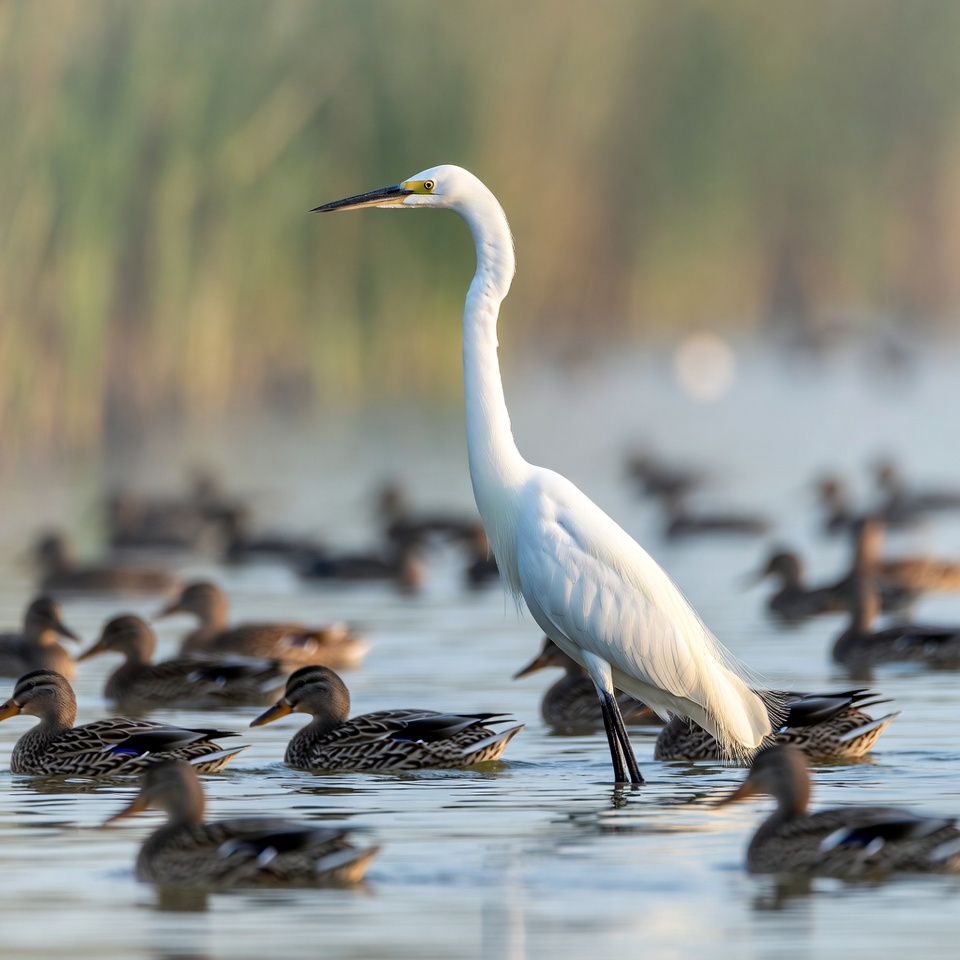 A tall white egret with a yellow beak stands in shallow water surrounded by numerous ducks. The ducks include mallards with green heads and various other breeds floating nearby. Reeds and misty water form the background.