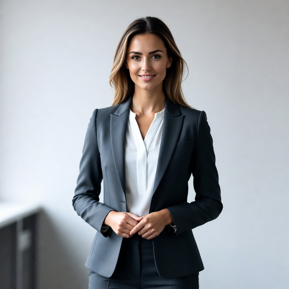 A young woman with long wavy brown hair smiles confidently at the camera. She wears a tailored gray blazer over a white collared blouse and matching pants. She stands with hands clasped in front of a plain gray background.