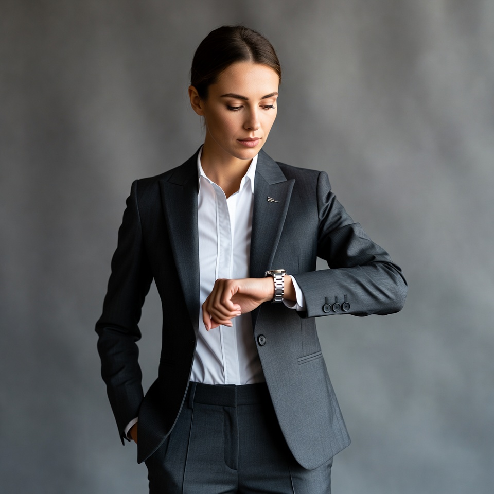 A young woman with dark hair in a bun stands against a gray background, wearing a gray blazer suit and white collared shirt. She looks down at her wristwatch with a serious expression while checking the time. Her hand is raised, and she has a small pin on her lapel.