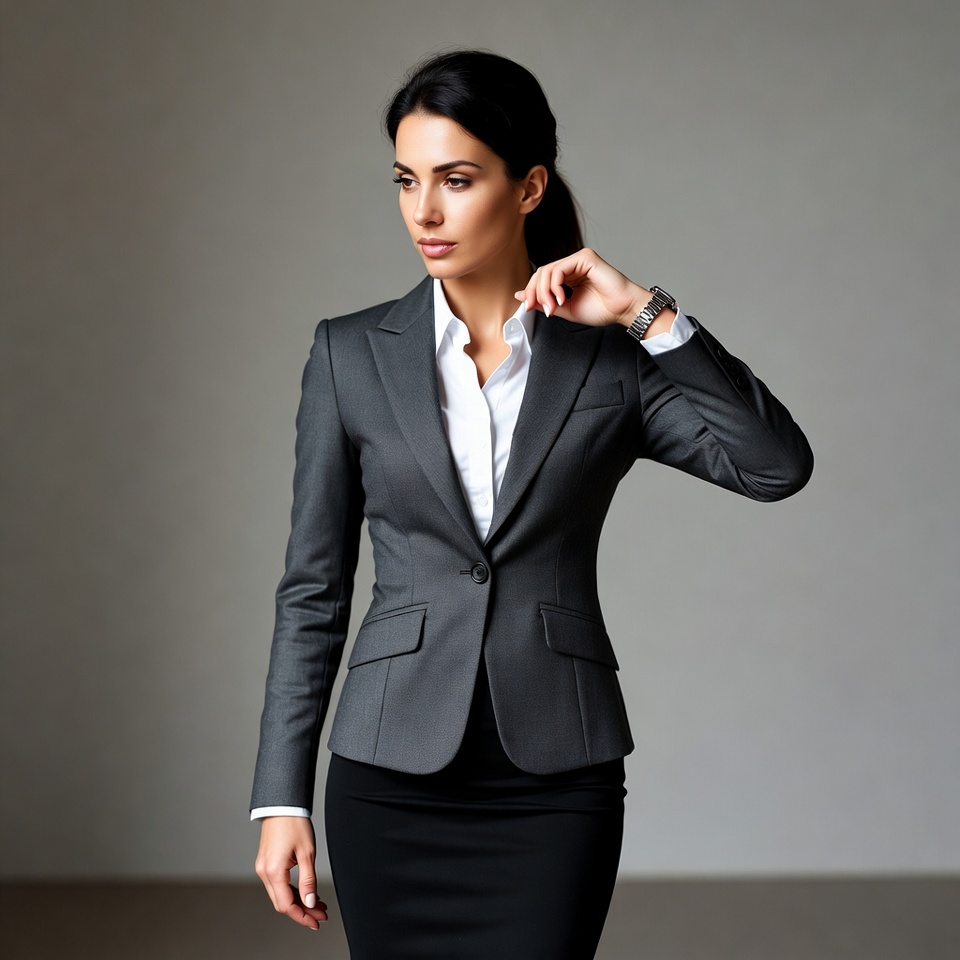 A woman with long dark hair pulled into a ponytail stands confidently against a gray background. She wears a fitted gray blazer over a white collared shirt and a black pencil skirt. Her hand touches her neck near a watch on her wrist.