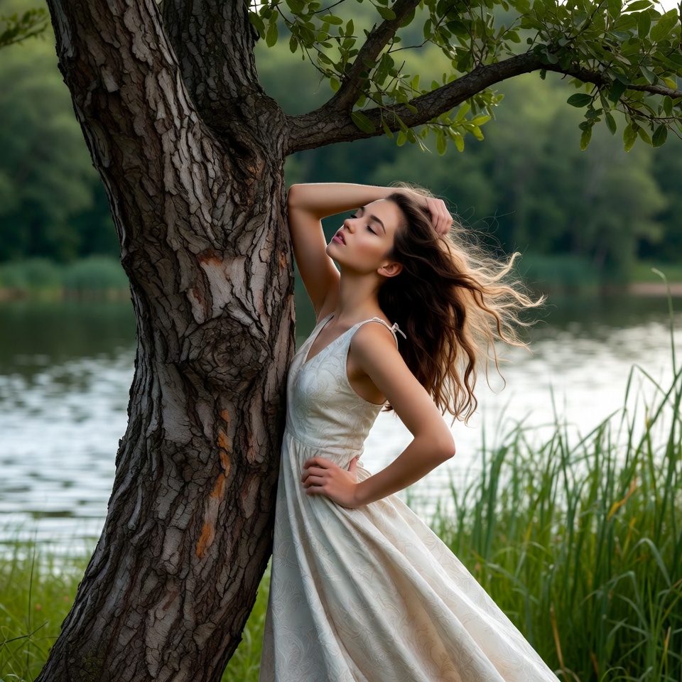 A young woman with long wavy brown hair leans against a large tree trunk near a calm lake. She wears a flowing white spaghetti-strap dress and poses with one hand on her hip and the other touching her face. Lush green reeds and forest surround the serene waterside scene.