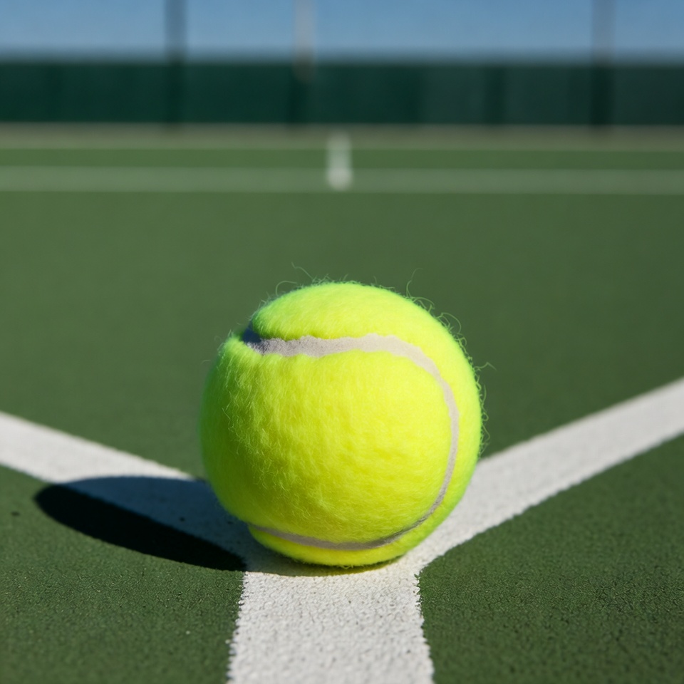 A yellow tennis ball sits on the white court lines of a green tennis court. The ball is fuzzy with a visible seam and casts a small shadow. A tennis net and fence are visible in the background under a clear blue sky.